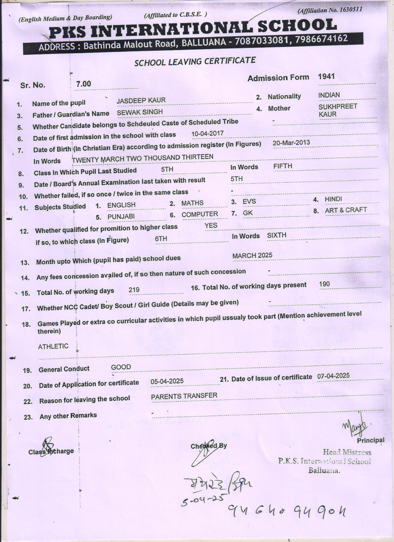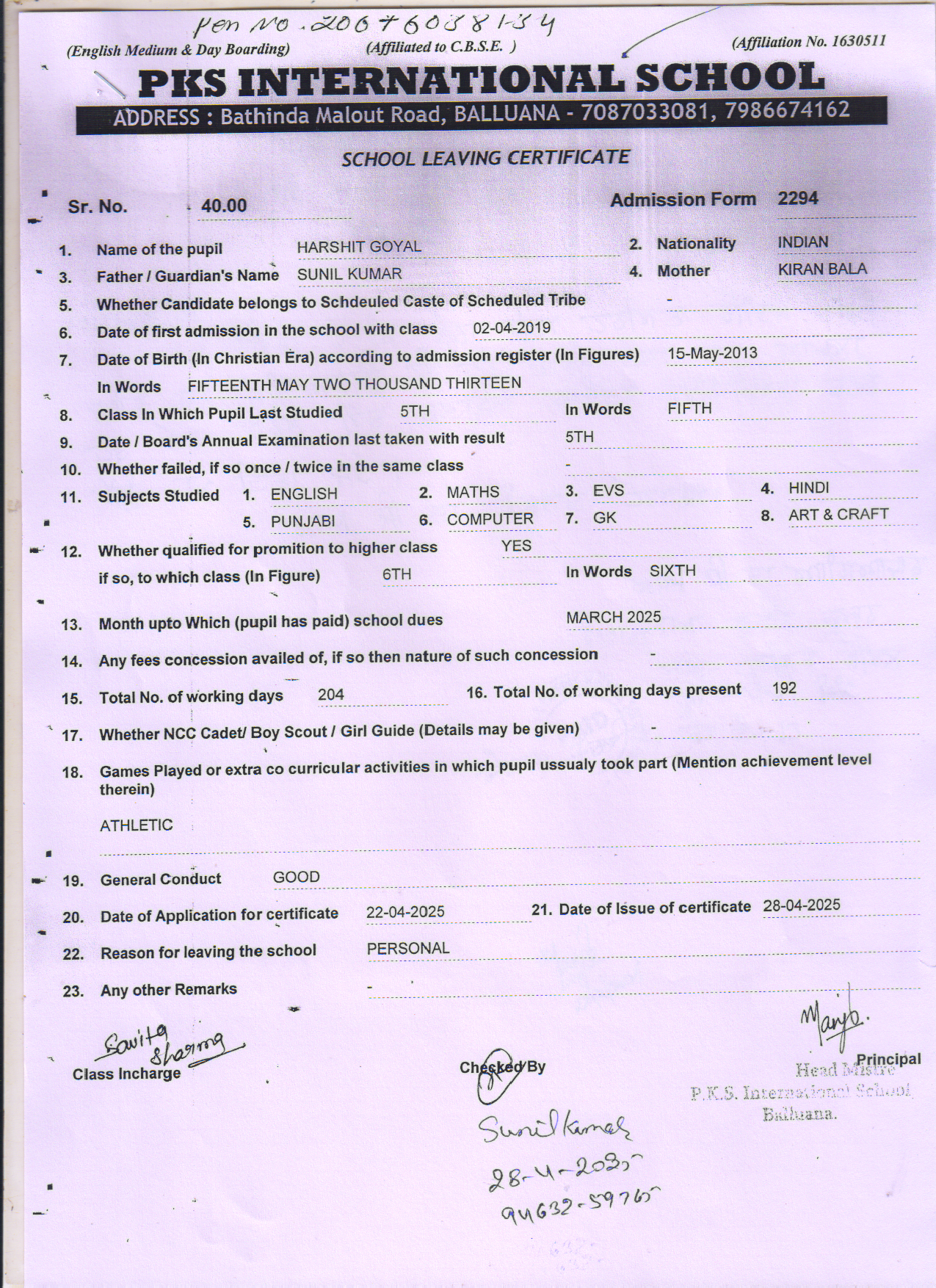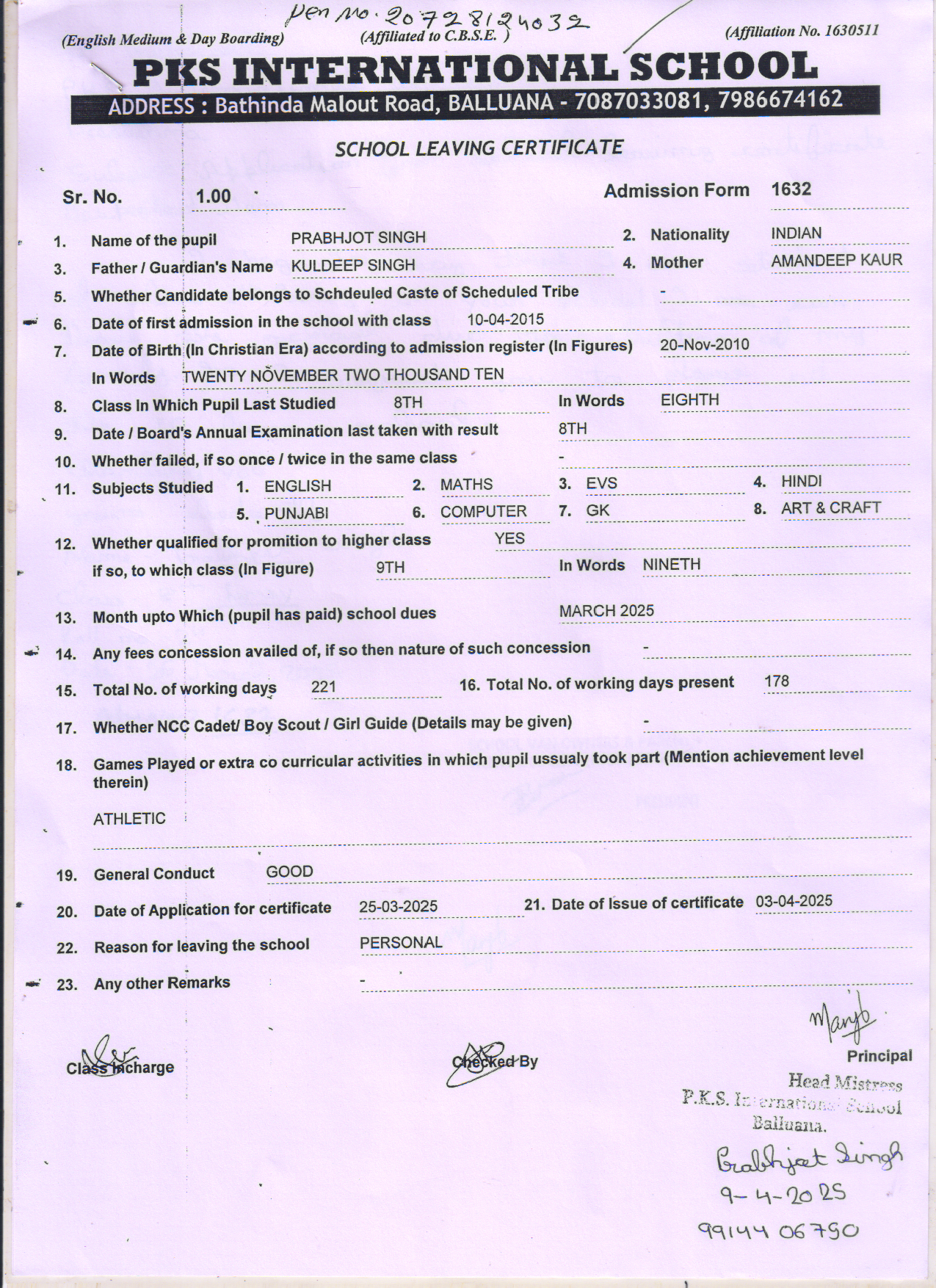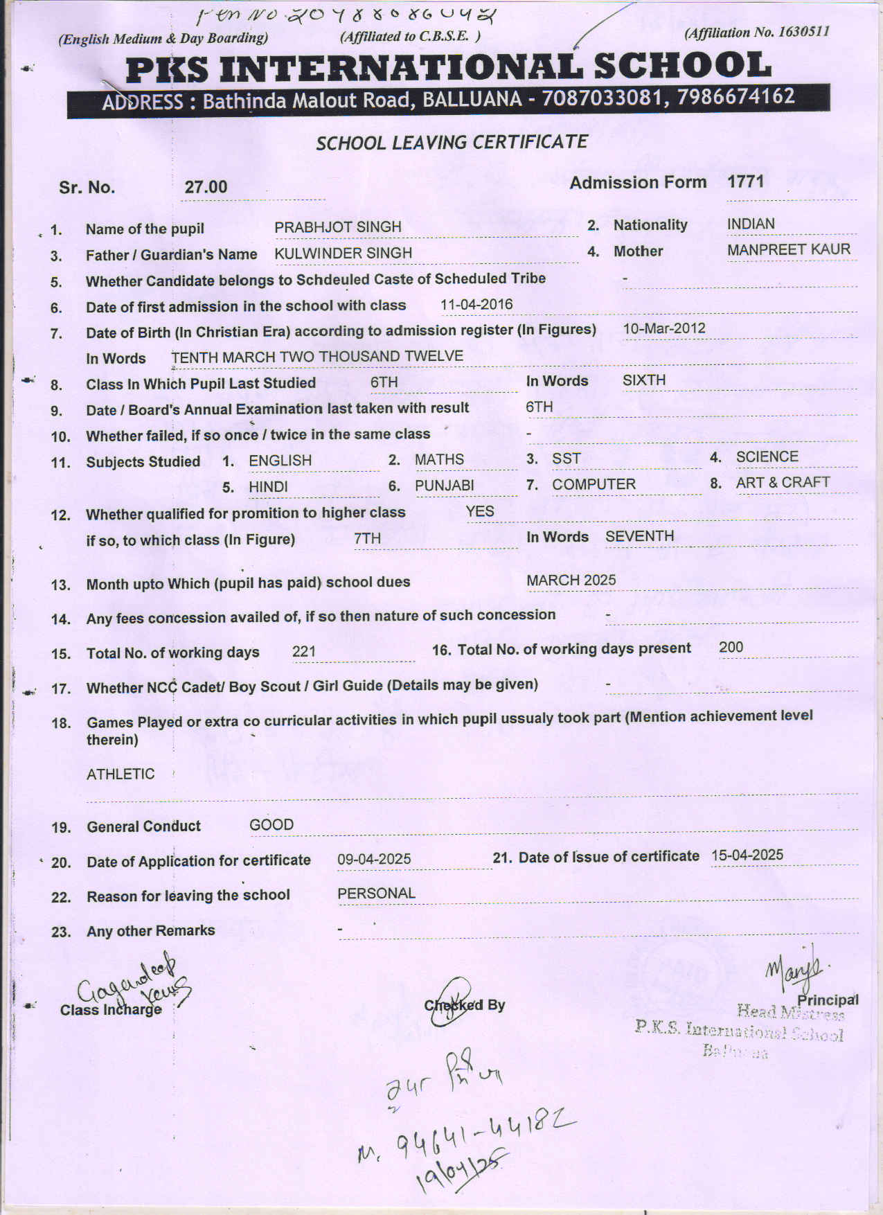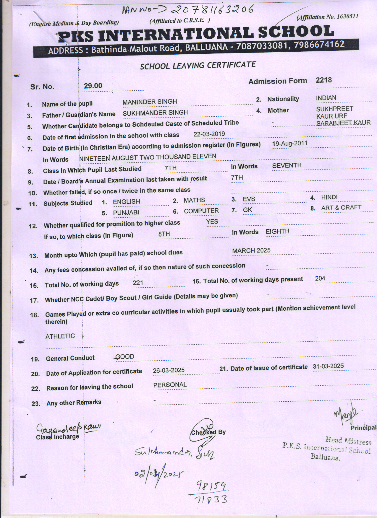 | Sr. No | Student Name | Admission No | Class | View Certificate |
