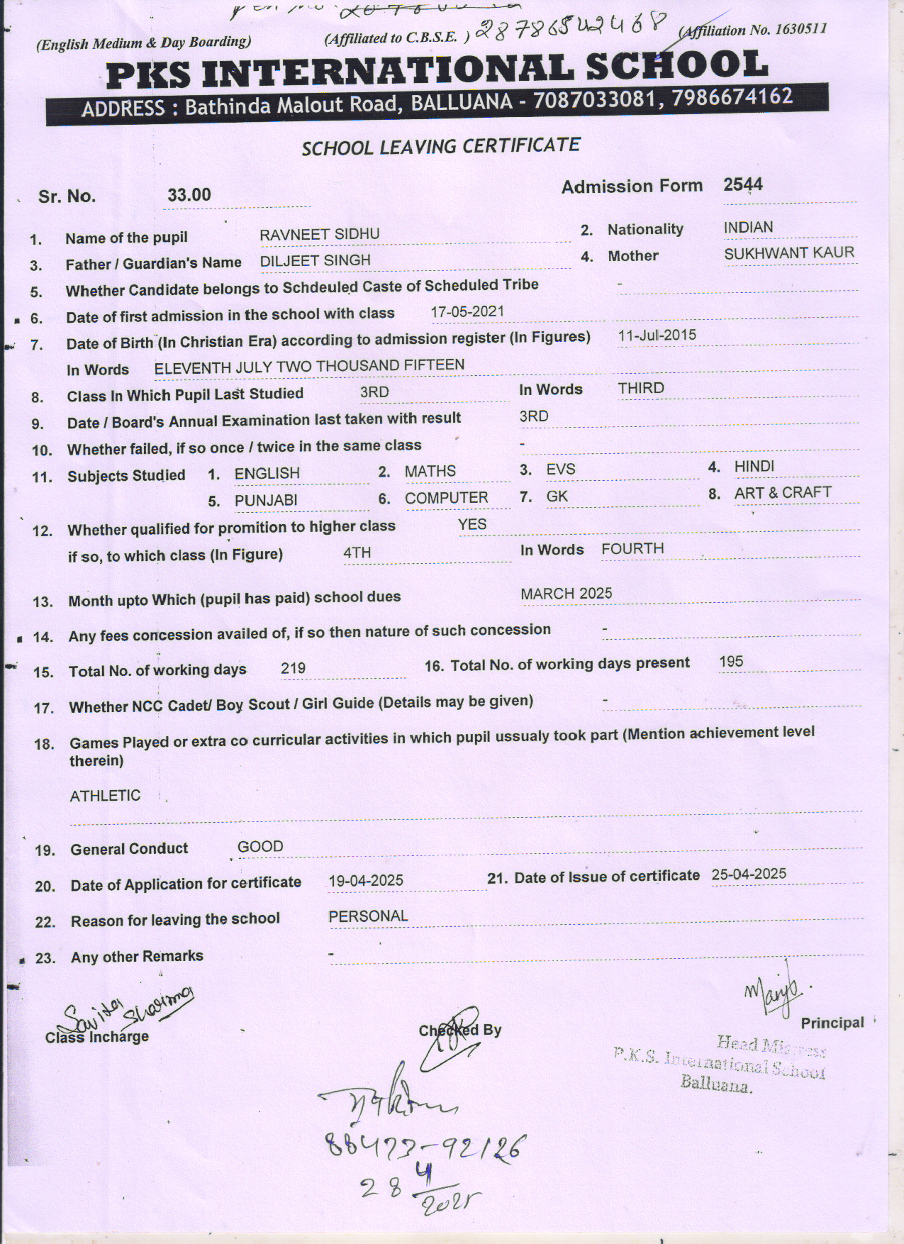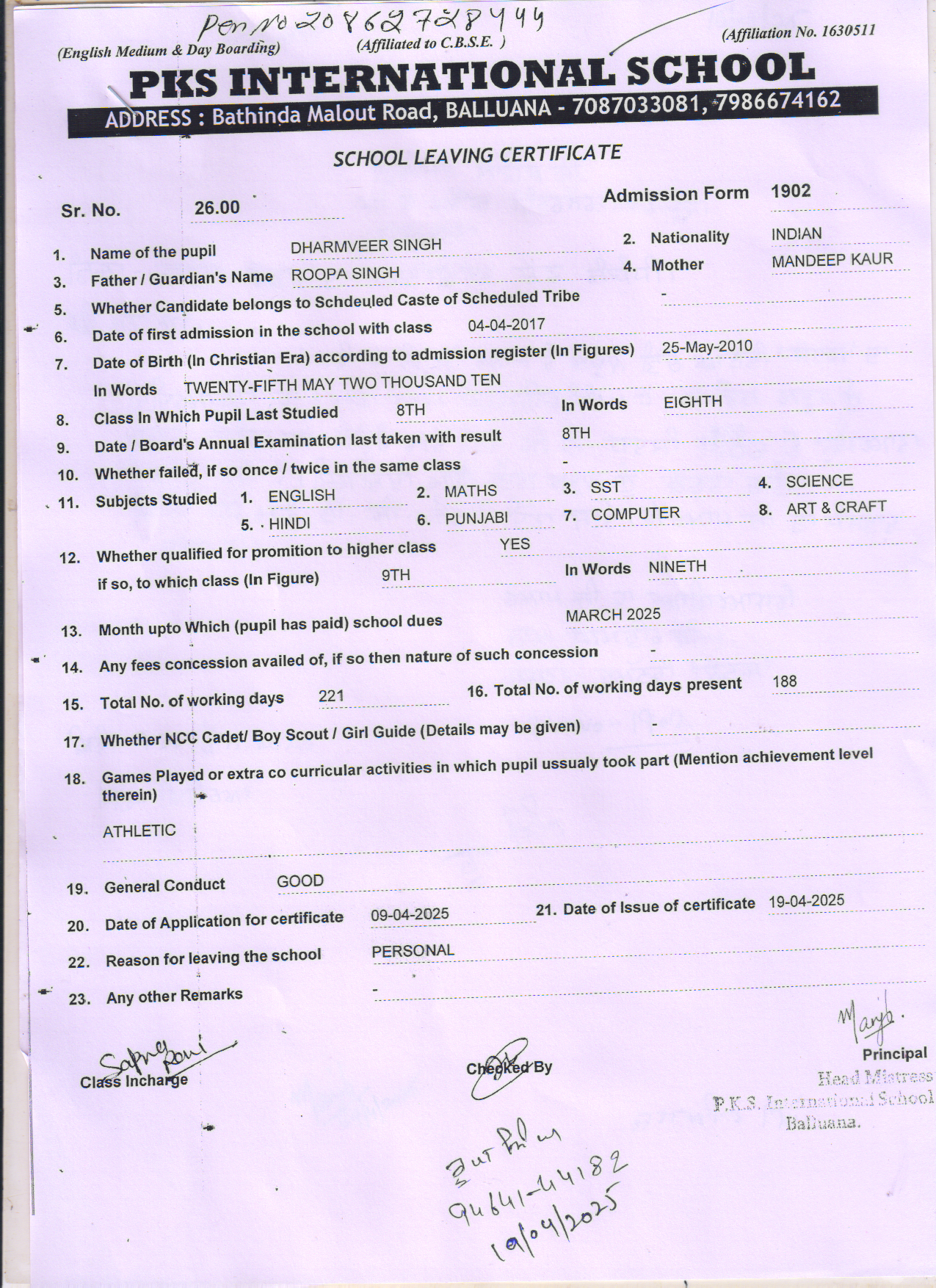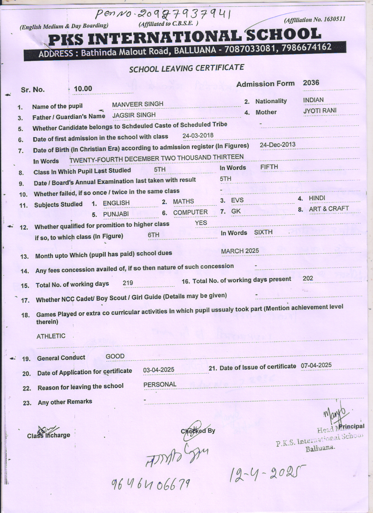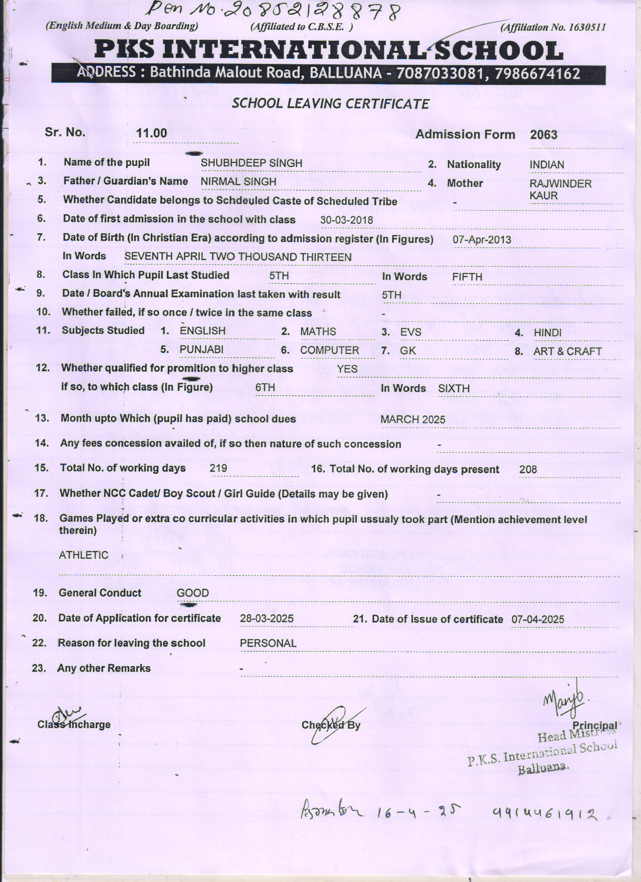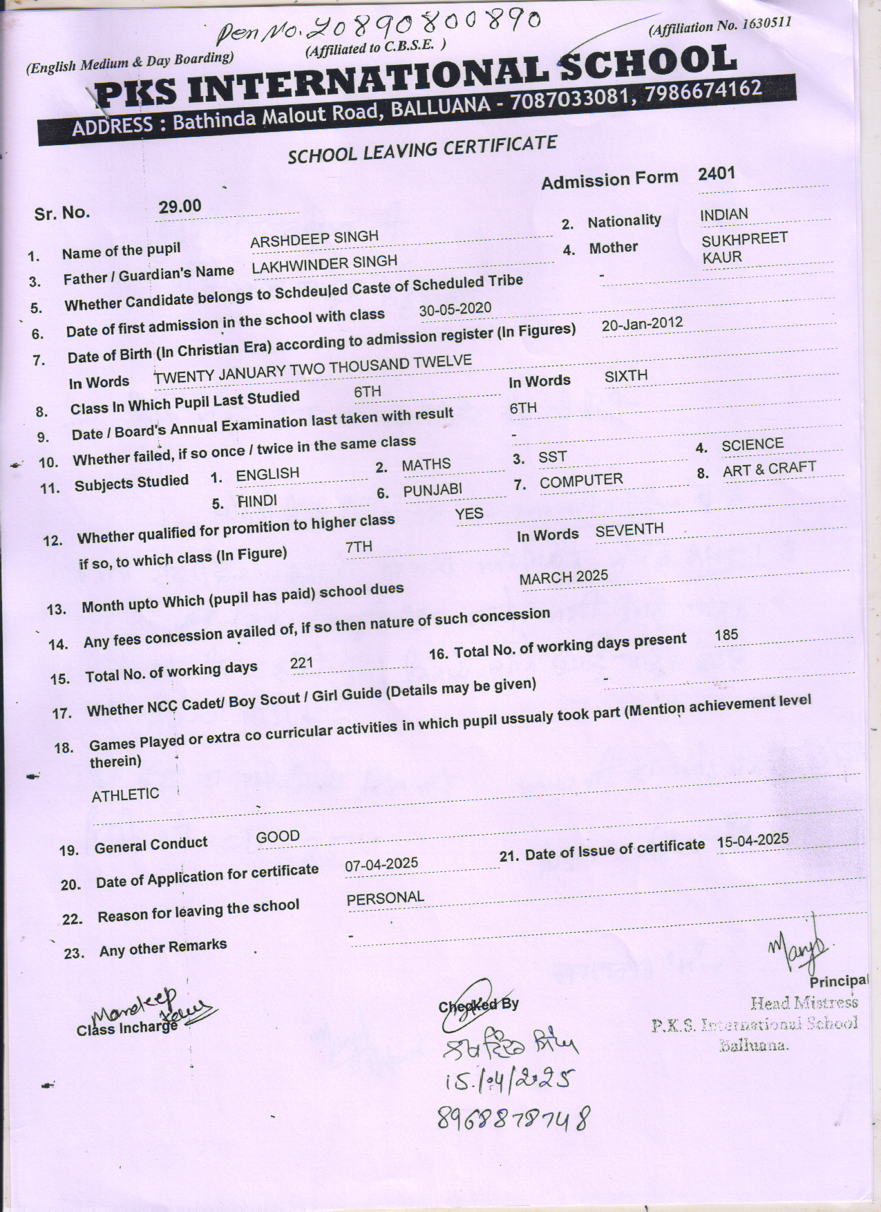 | Sr. No | Student Name | Admission No | Class | View Certificate |