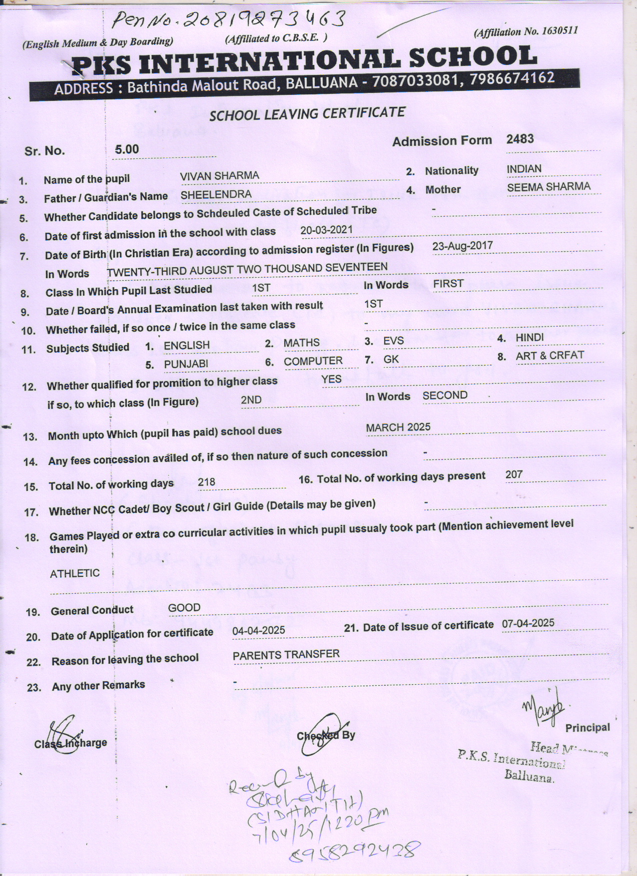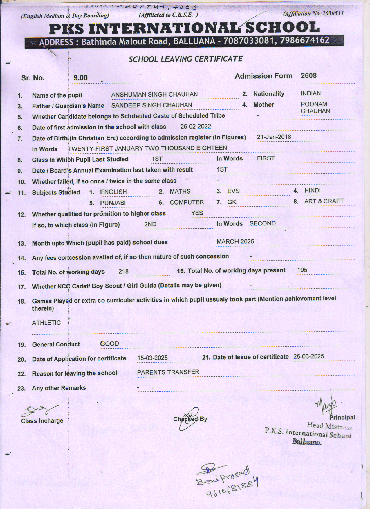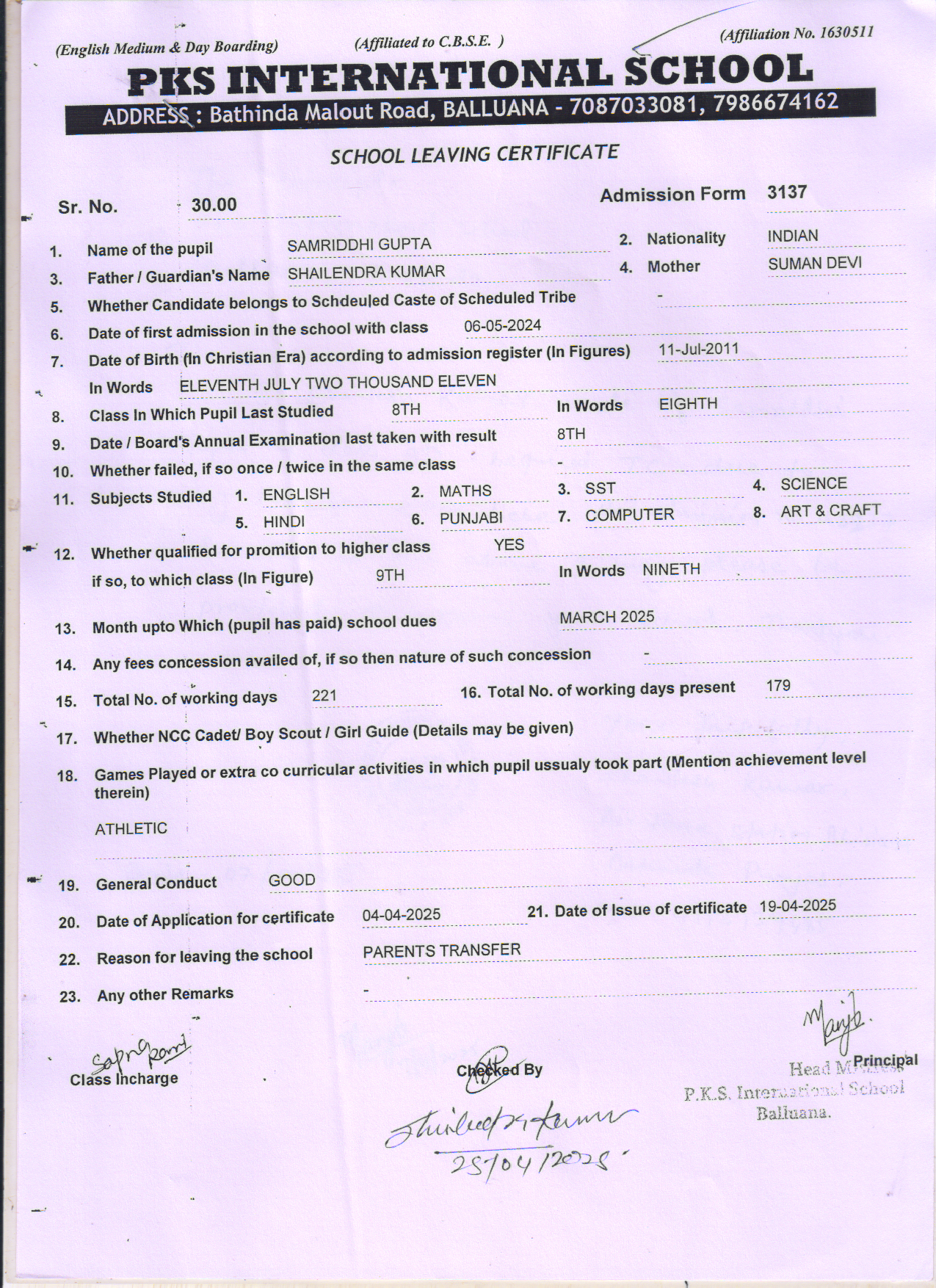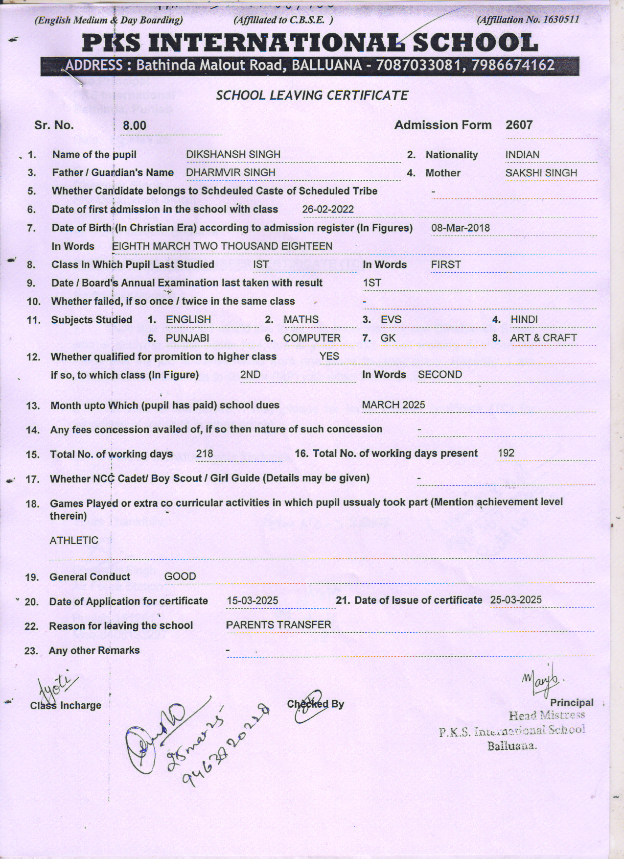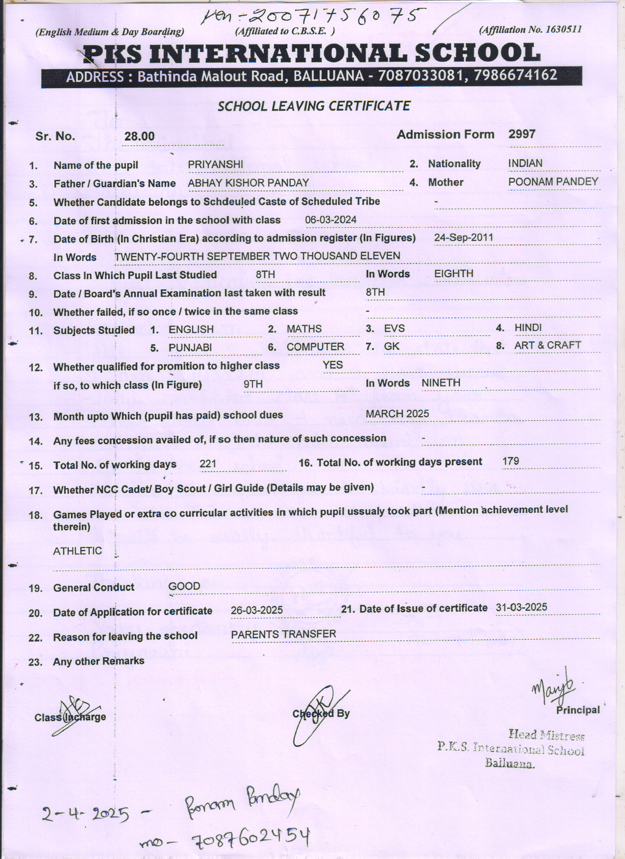 | Sr. No | Student Name | Admission No | Class | View Certificate |
