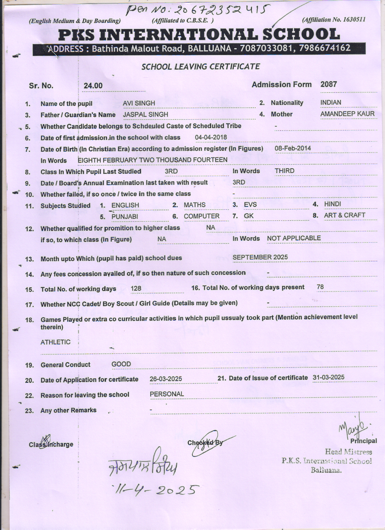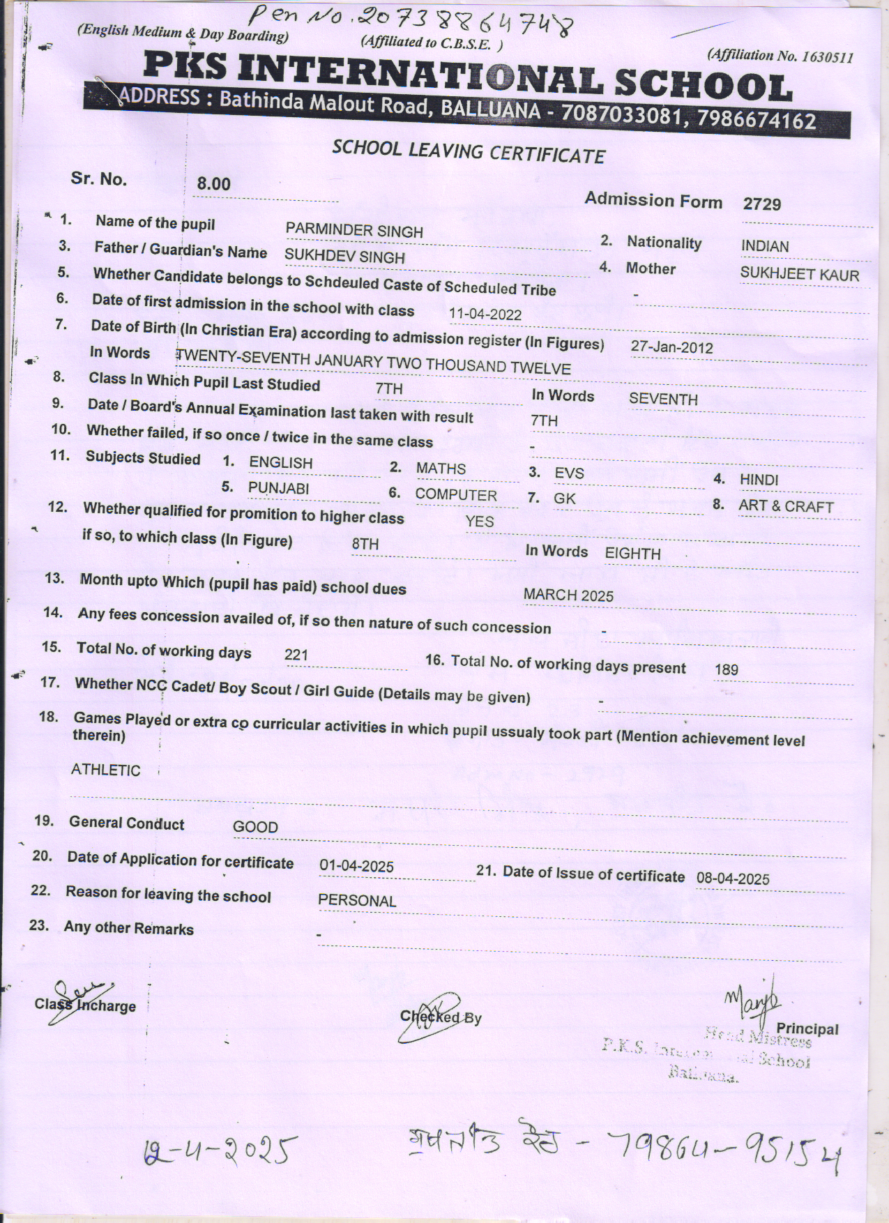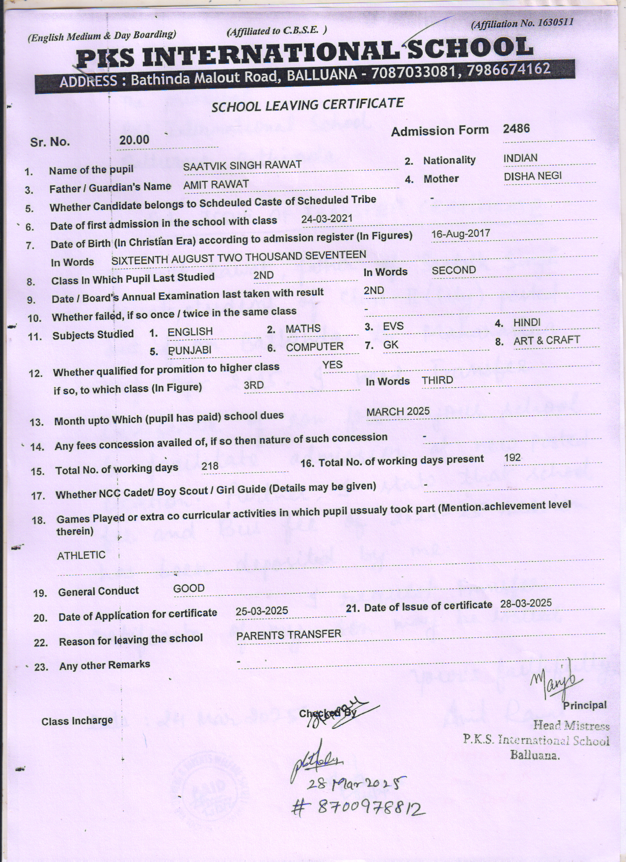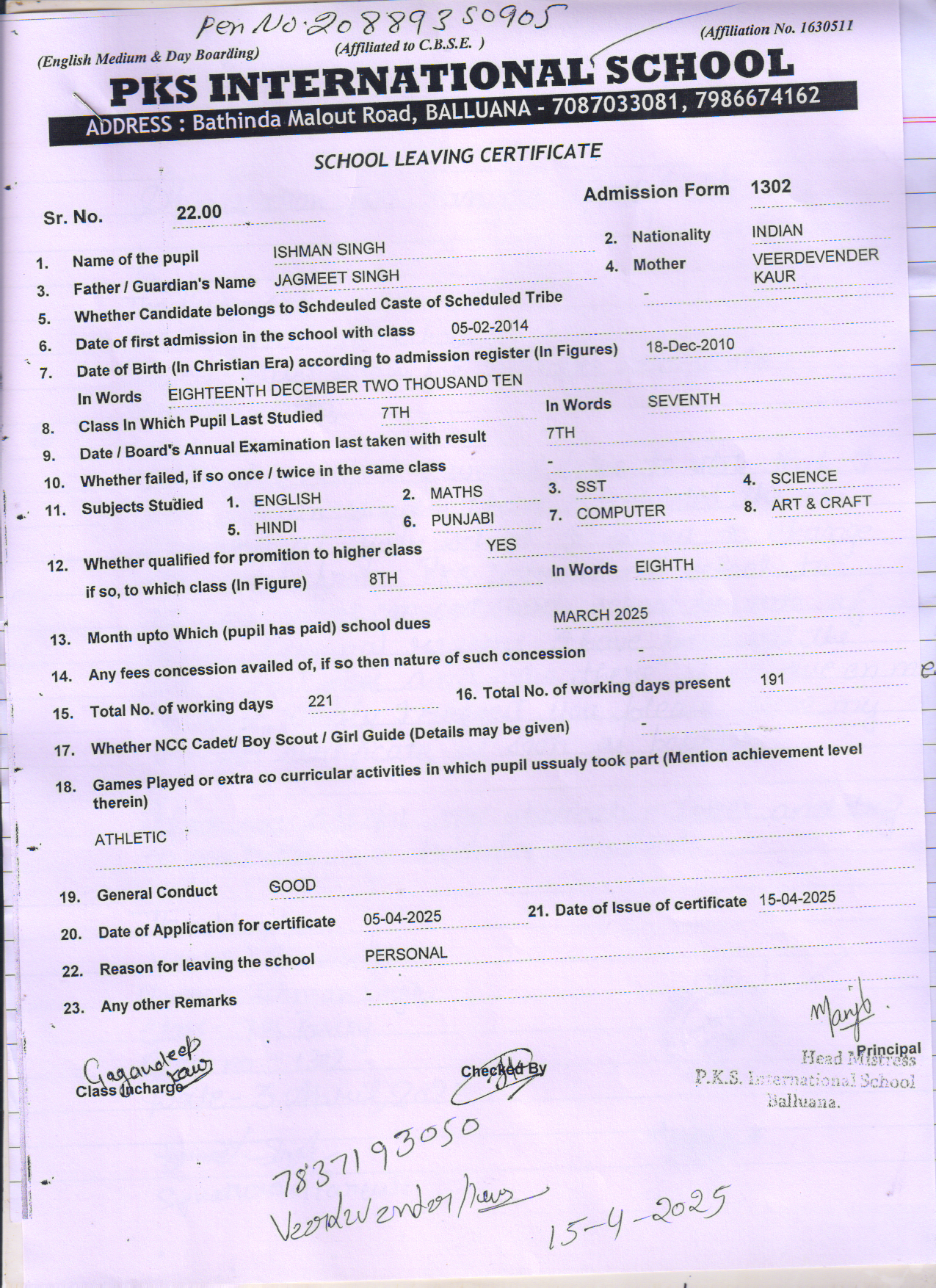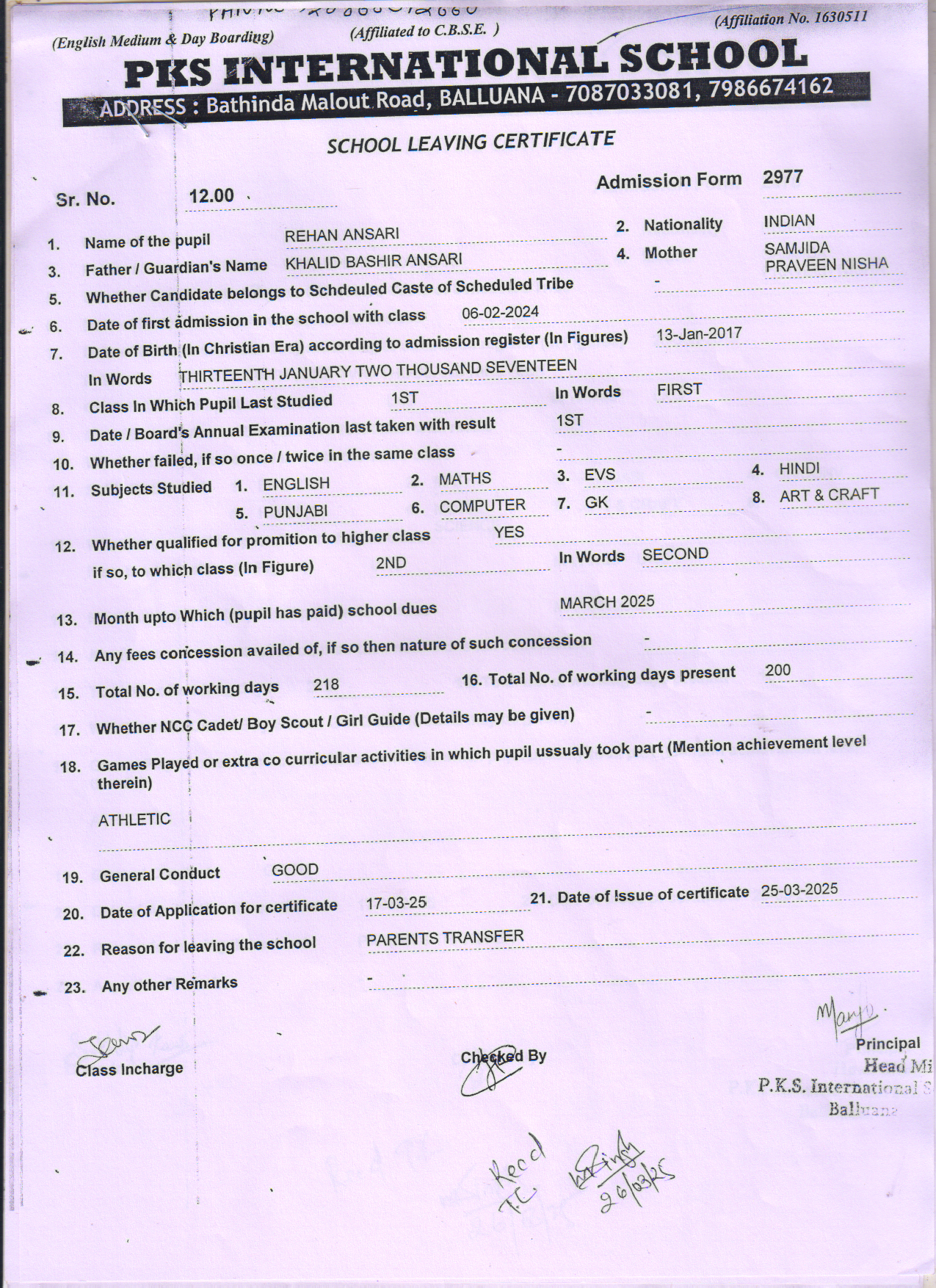 | Sr. No | Student Name | Admission No | Class | View Certificate |